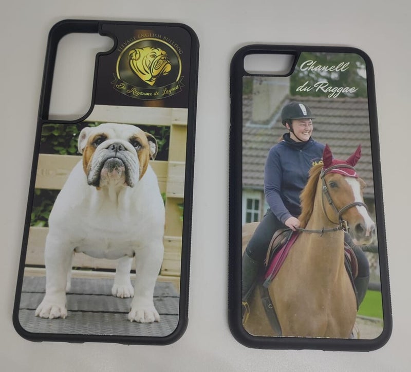 Coque de téléphone noire , impression numérique sur une plaque alu adaptée en finition brillante pour une tenue parfaite dans le temps .